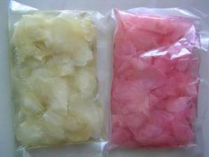 Choose the fresh and young ginger, rinse them into brine, sliced into pieces, between 0.8mm and 1.5mm,preserved in acetic acid and candied, sometimes add some natural color additives.