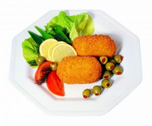A fillet of chicken breast stuffed with butter and Provencal herbs, formed, breaded.